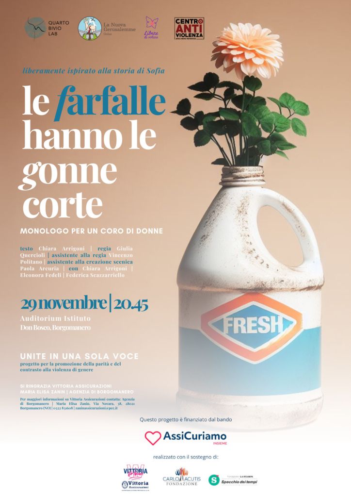 Dopo le due anteprime nazionali del 24 novembre, il monologo teatrale per un coro di donne, dal titolo Le farfalle hanno le gonne corte, andrà in scena venerdì 29 novembre, alle ore 20.45, presso il teatro del Collegio Don Bosco di Borgomanero (No).