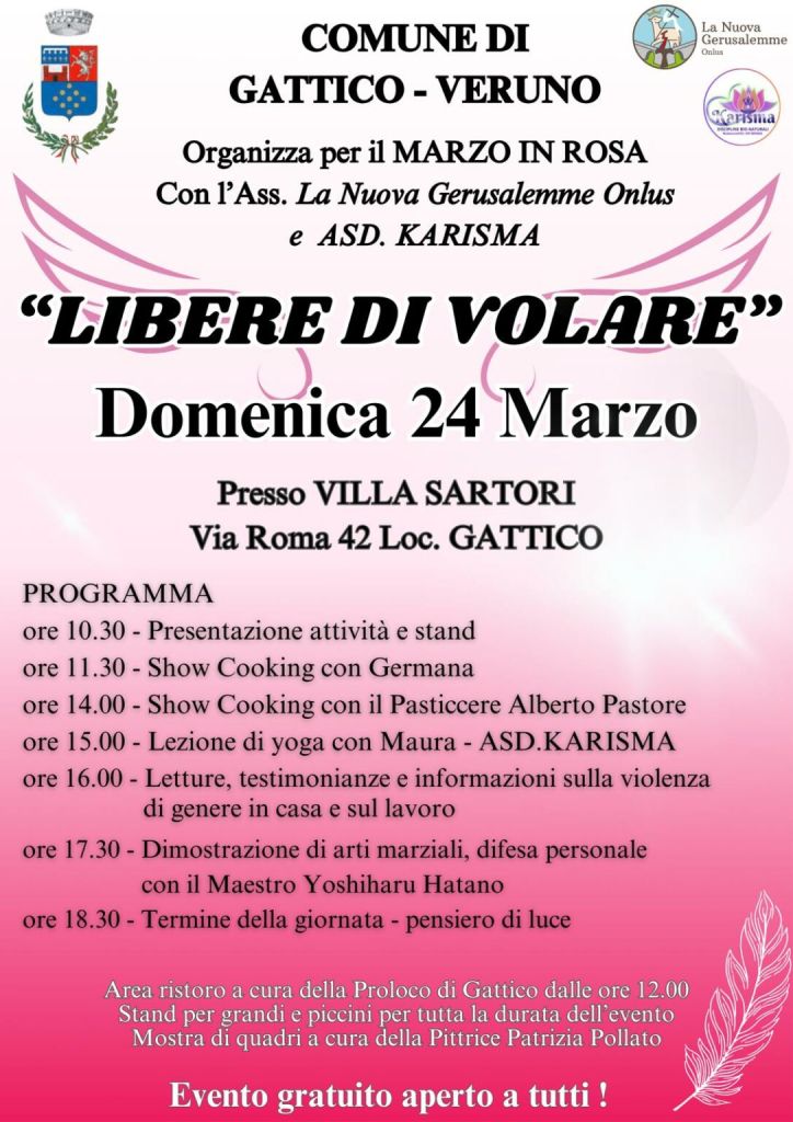 Libere di volare 24 MARZO 2025 Gattico – Novara All’interno del parco di Villa Sartori, una giornata per dire no alla violenza contro le donne. Evento promosso dal Comune di Gattico.Ingresso libero. Le donazioni raccolte durante l’evento saranno devolute all’associazione La Nuova Gerusalemme Onlus.